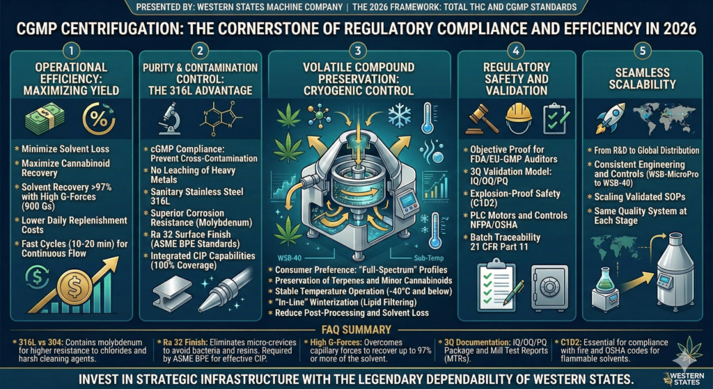 In the competitive landscape of 2026, the “cost per gram” is dictated by the efficiency of your equipment and the reliability of your compliance status. Choosing a cGMP-compliant centrifuge from Western States Machine Company is a strategic investment that protects your product’s purity, your personnel’s safety, and your company’s regulatory standing.