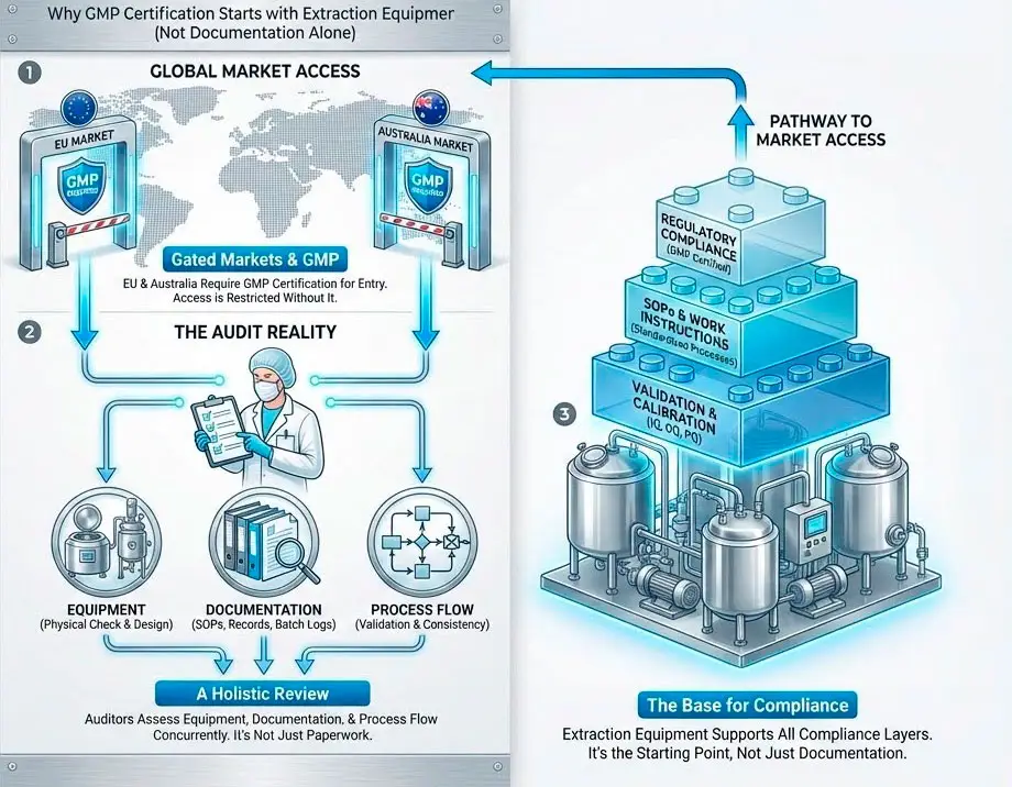 To reach standards such as EU-GMP or US-cGMP (FDA), extraction equipment must satisfy three non-negotiable requirements: sanitary design, process validation, and absolute traceability.